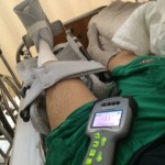 大腿四頭筋のほうへ移動してしまった膝蓋骨に穴を開けて中空になったピンを通し、その中にワイヤーを通して、ワイヤーの先をスネの脛骨先端部分にアンカーで打ち込み、皿の位置を戻して切れた膝蓋腱をつなぎ、膝の中心まで吹っ飛び、ひっくり返った状態で見つかった外側半月板を元の位置に縫合してもらって21日。